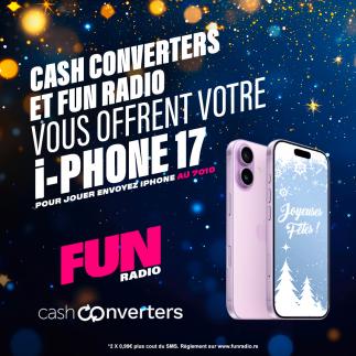 CASH CONVERTERS et Fun Radio vous offrent un iPhone 17 pour Noël ! Envoyez IPHONE par SMS au 7010 pour tenter votre chance. Du lundi au vendredi, de 16h à 19h, Olivier sélectionnera un participant pour le tirage au sort final, qui aura lieu le vendredi 26 décembre. Votre iPhone 17 offert par CASH CONVERTERS et Fun Radio.