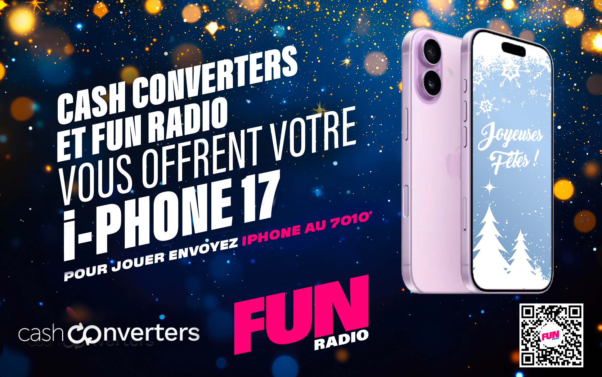 CASH CONVERTERS et Fun Radio vous offrent un iPhone 17 pour Noël ! Envoyez IPHONE par SMS au 7010 pour tenter votre chance. Du lundi au vendredi, de 16h à 19h, Olivier sélectionnera un participant pour le tirage au sort final, qui aura lieu le vendredi 26 décembre. Votre iPhone 17 offert par CASH CONVERTERS et Fun Radio.